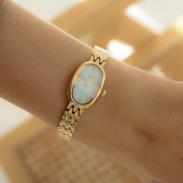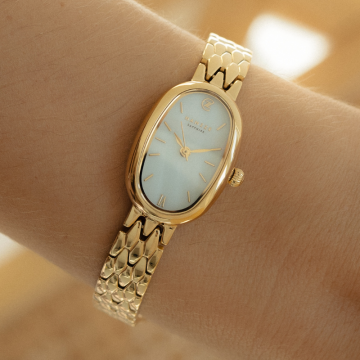 Poznaj zegarek z kolekcji La Mer, który łączy precyzję z wyrafinowaną, biżuteryjną elegancją. Złota, owalna koperta wykonana ze stali szlachetnej z powłoką PVD harmonijnie komponuje się z równie luksusową, złotą bransoletą, tworząc całość pełną subtelnego wdzięku. Tarcza wykonana z naturalnej muszli, dostępna w czterech pięknych kolorach, dodaje każdemu modelowi niepowtarzalnego charakteru i głębi, tworząc wrażenie prawdziwego dzieła sztuki.