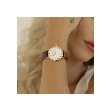 Klasyczny zegarek Heritage ze złotą kopertą ze stali szlachetnej i skórzanym, brązowym paskiem to kwintesencja elegancji. Wyposażony w szwajcarski mechanizm Ronda oraz szafirowe szkło łączy ponadczasowy styl z niezawodnością.