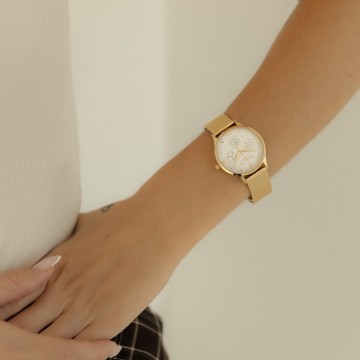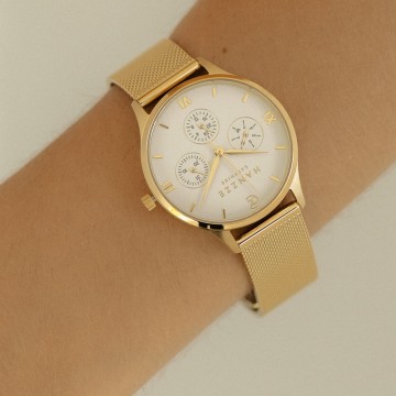 Wyrazisty, okrągły czasomierz w złotym kolorze z niezawodnym mechanizmem Seiko, szafirowym szkłem i trwałą stalową kopertą. Zegarek wyposażono w elegancką bransoletę mesh wykonaną ze stali szlachetnej oraz 3 dodatkowe subtarcze, podkreślające jego funkcjonalność i styl.