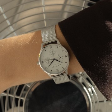 Wyrazisty, okrągły czasomierz w srebrnym kolorze z niezawodnym mechanizmem Seiko, szafirowym szkłem i trwałą stalową kopertą. Zegarek wyposażono w elegancką bransoletę mesh wykonaną ze stali szlachetnej oraz 3 dodatkowe subtarcze, podkreślające jego funkcjonalność i styl.
