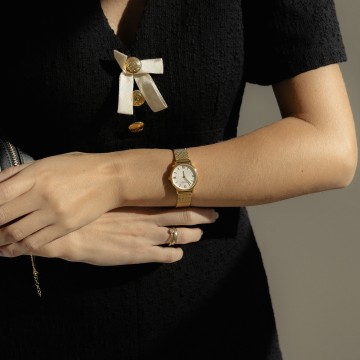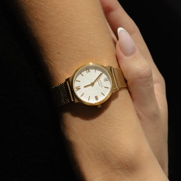 Model dostępny jest w dwóch stylowych wariantach: ze złotą bransoletą typu mesh ze stali szlachetnej oraz z czarnym paskiem materiałowym typu NATO – oba podkreślają wszechstronność zegarka i pozwalają dopasować go do różnych stylizacji.
